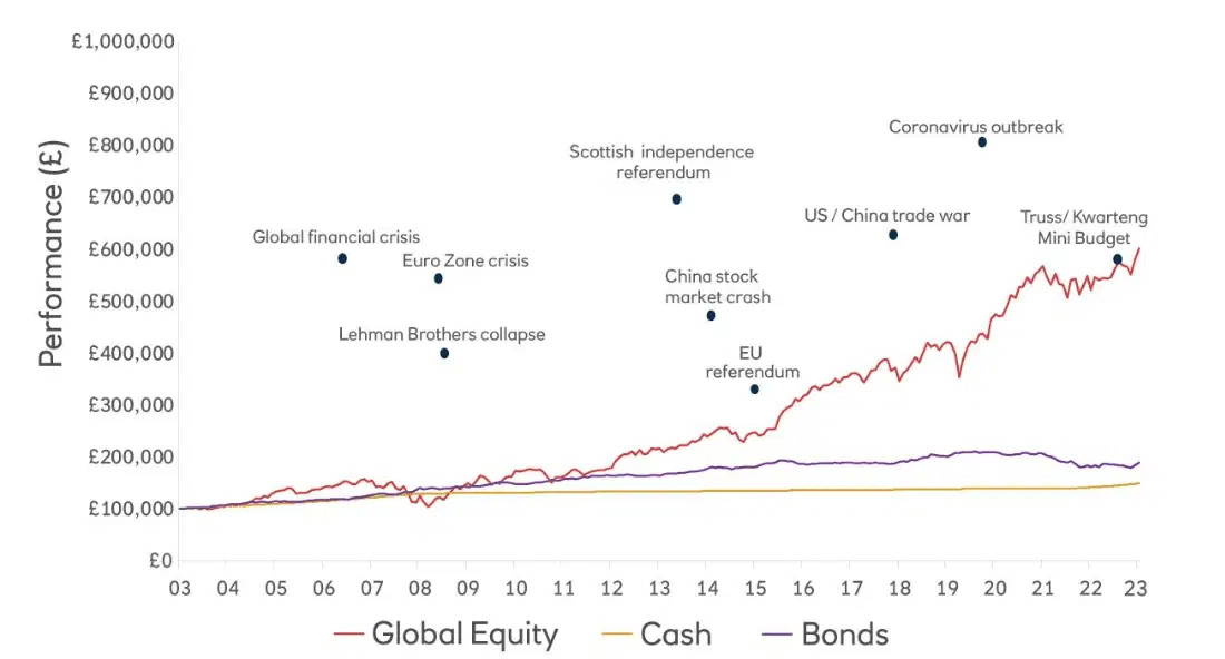 The below graph from NatWest covering the period between 2003 and 2023 highlights this, showing the return on global equities (shares), bonds, and cash at critical points in history. Although cash remains relatively level, the eventual returns from bonds and equities would have been higher.